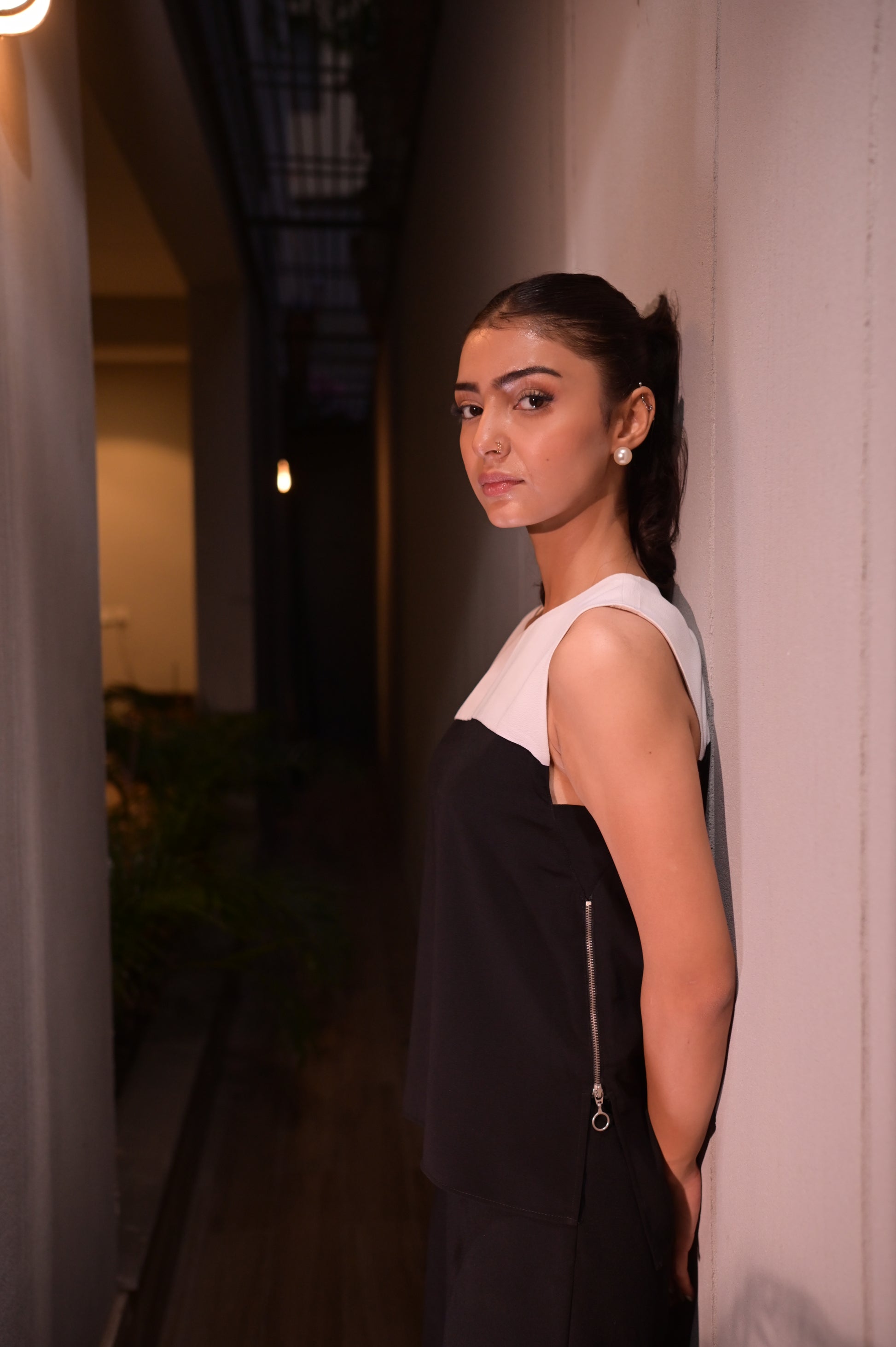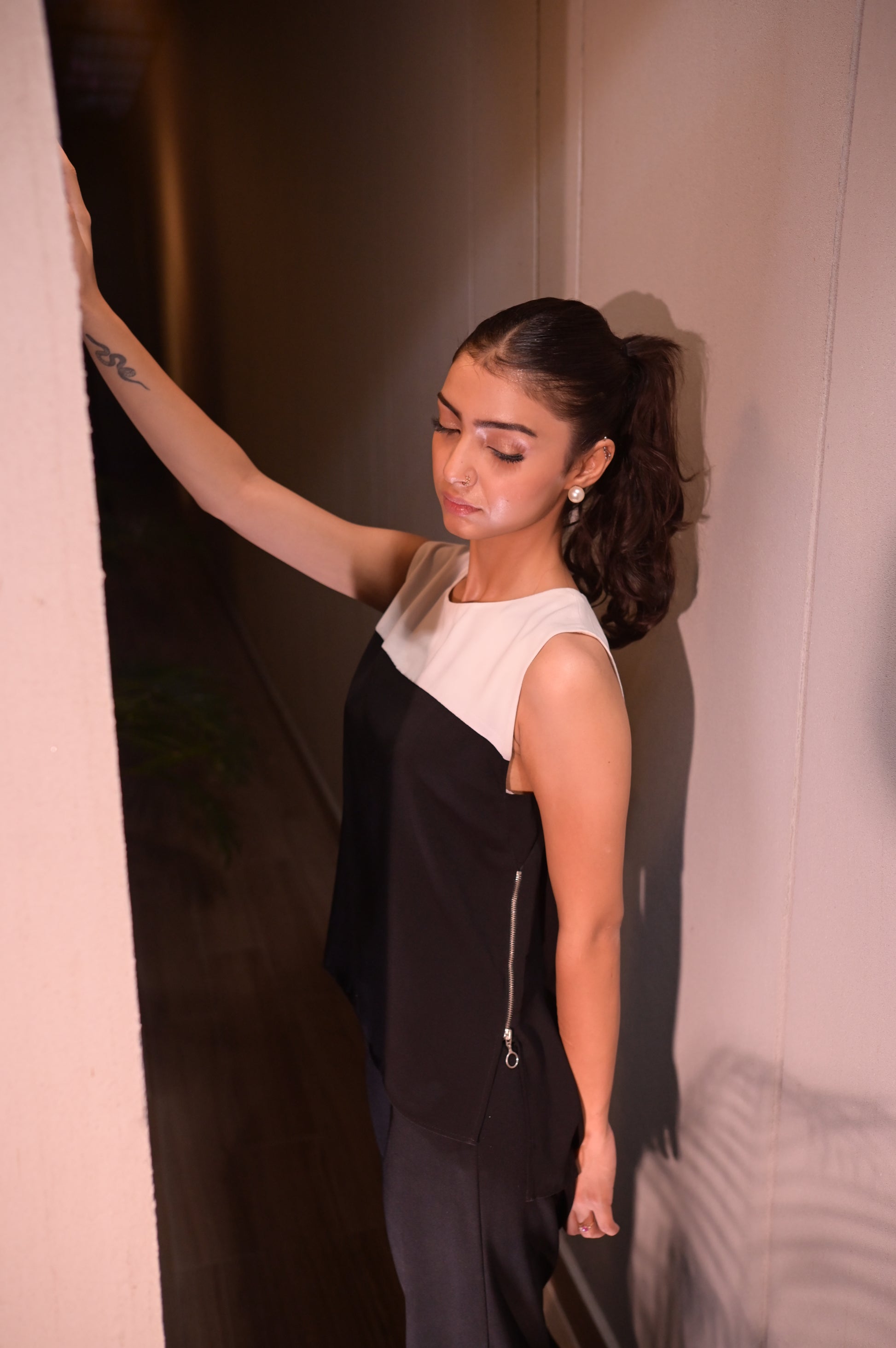 Sleeveless top featuring a contrast round neckline in ivory and a deep black body. Crafted in a structured satin blend for a polished finish. Functional silver-tone zipper on the side adds an urban edge. Clean-cut armholes and a relaxed fit.